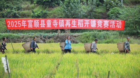 自貢網(wǎng)自貢融媒記者 周嘉 芶思 文/圖 好事隨秋至。眼下,富順縣45.2萬畝再生稻迎來豐收。9月22日下午,在富順縣童寺鎮(zhèn)老寨村舉辦的“富順縣再生稻開鐮競賽”現(xiàn)場,10余名參賽選手爭分奪秒地揮舞鐮刀,力爭每一粒糧食都能歸入倉庫。金黃色的稻田中,選手們彎腰揮鐮,稻穗應聲而落,田埂上加油聲、歡呼聲此起彼伏,汗水與笑容在秋日里交織成一幅生動的“豐收畫卷”?!案钏臼莻€技術活,刀口高了秸稈不夠長,撻谷子就會費力