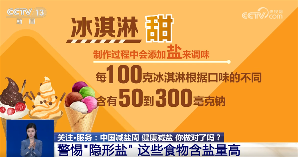 冰淇淋一般大家覺得是甜的,其實(shí)在制作過程中也會添加鹽來調(diào)味。每100克冰淇淋根據(jù)口味的不同含有50到300毫克鈉。