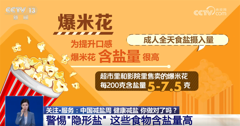 為了提升口感,爆米花的含鹽量是很高的,超市里和影院里售賣的爆米花每200克含鹽量5—7.5克,差不多是成人全天食鹽攝入量。