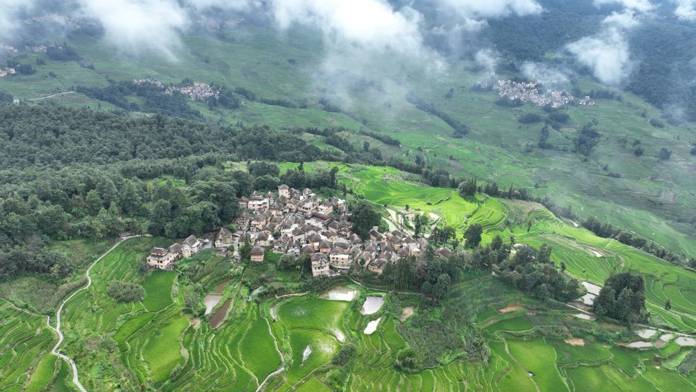 云南省紅河哈尼族彝族自治州元陽(yáng)縣阿者科村風(fēng)光(2024年7月19日攝,無(wú)人機(jī)照片)。新華社發(fā)(張艷攝)