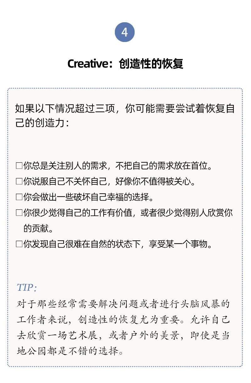 因此,當(dāng)你選擇了適合自己的休息方式,你會(huì)把注意力集中在這個(gè)地方,讓你和自己聯(lián)系起來,回到當(dāng)下。