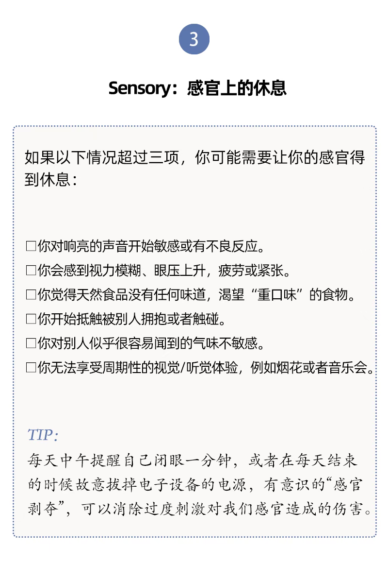 高質(zhì)量休息的體驗(yàn),是一種存在,而不是做了什么。我們總結(jié)了高質(zhì)量休息必不可少的三個(gè)要素,供大家參考: