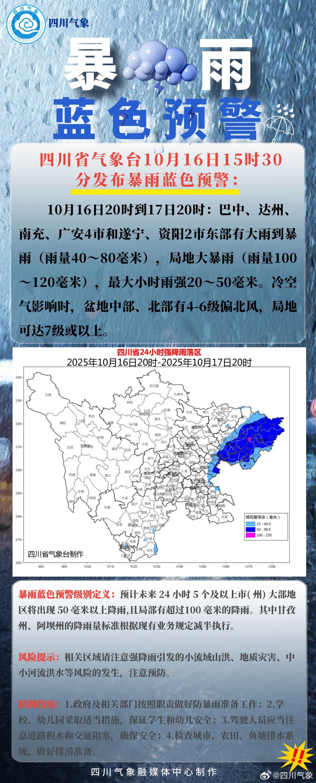 四川省氣象臺10月16日15時30分發(fā)布暴雨藍色預(yù)警: