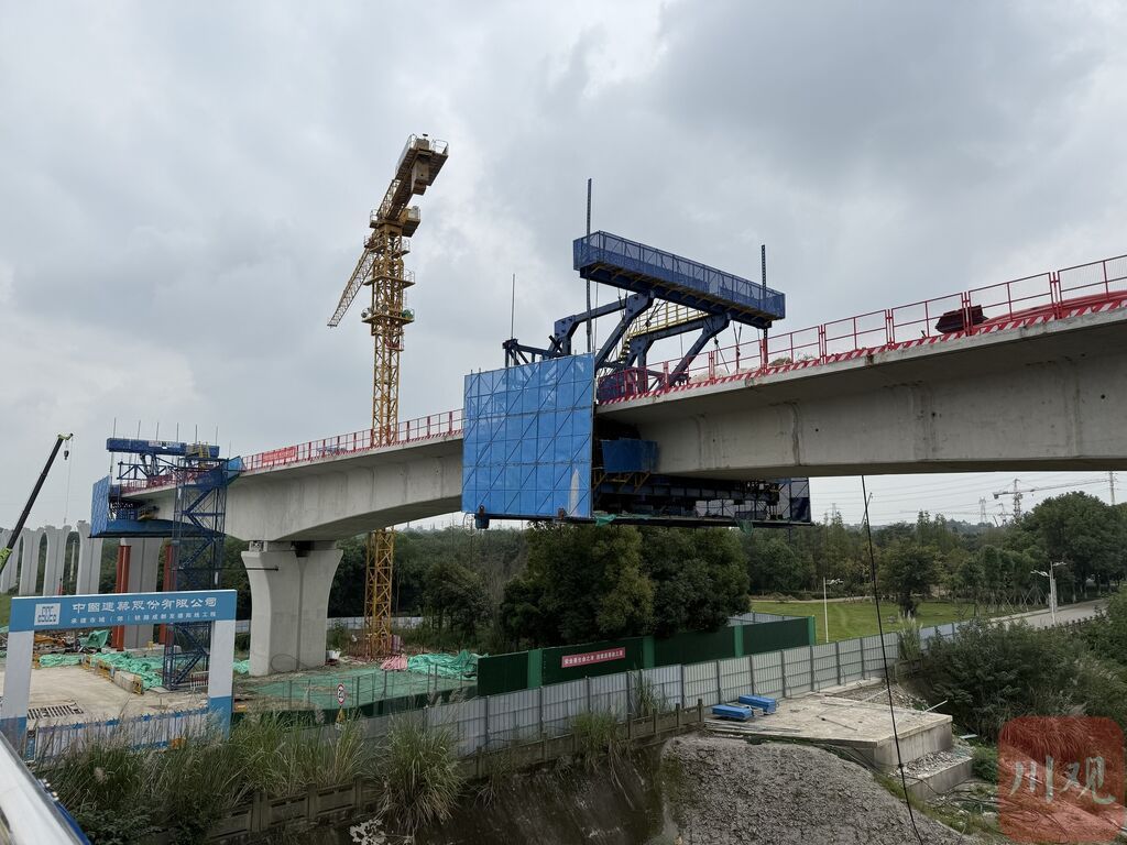 “看,這就是控制性工程鴨子河大橋!”順著四川成德軌道交通有限公司土建四工區(qū)業(yè)主代表張智勇手指的方向,記者看到,全長496米的大橋,樁基、承臺、橋墩已全部完成,4座橋墩穩(wěn)穩(wěn)矗立河中,河面上橋梁段也已架設(shè)到位。北岸31、32號墩之間,移動(dòng)掛籃正在作業(yè),兩段橋體即將“牽手”合龍。