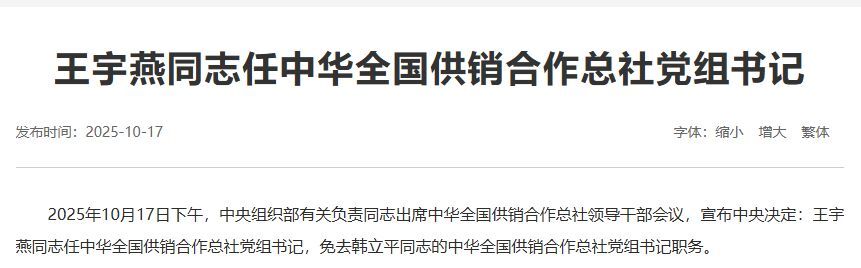 據(jù)中華全國(guó)供銷合作總社網(wǎng)站消息,2025年10月17日下午,中央組織部有關(guān)負(fù)責(zé)同志出席中華全國(guó)供銷合作總社領(lǐng)導(dǎo)干部會(huì)議,宣布中央決定:王宇燕同志任中華全國(guó)供銷合作總社黨組書記,免去韓立平同志的中華全國(guó)供銷合作總社黨組書記職務(wù)。